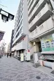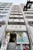 不忍通り沿いの、総戸数19戸の細長い外観のマンション。