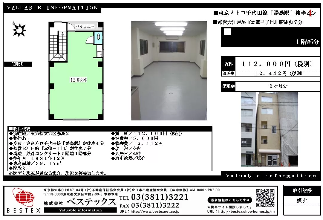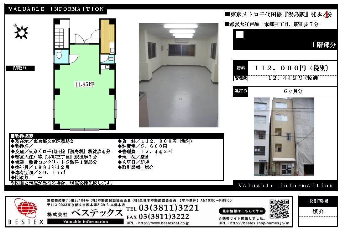 | 備考 | 賃貸事務所『小河原ビル』になります。 詳細閲覧ありがとうございます。最新の空室の確認、内覧のご予約はメール・電話にてお問い合わせください。 文京区の賃貸マンション・賃貸アパートはベステックスにおまかせください! | ||