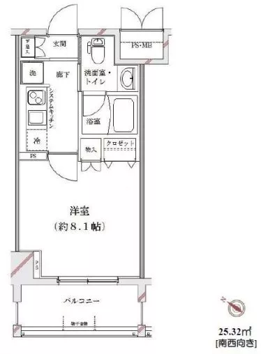| 間取り | 1K | 面積 | 25.32㎡ |