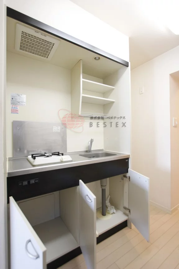 単身者向けの1Kタイプでキッチンスペースと居住スペースは扉で仕切られているのでお料理の匂いも気になりません。1口コンロですが、調理スペースがかなり広くなっており、冷蔵庫・電子レンジもキッチン横におけるので効率的にお料理を進める事ができます。