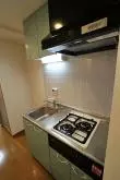 キッチンは2口ガスシステムキッチンとなっております。冷蔵庫置場が廊下部分にあるので居室に持っていく必要がなく、その分余裕を持ってスペースを室内の活用出来ます。