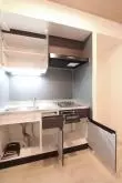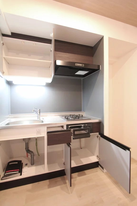 キッチンは、ガスコンロが二口有り、調理スペース・収納スペースも十分に確保されており、まな板を置いてお料理ができます。冷蔵庫・電子レンジもキッチン横に置けるので、効率的にお料理を進める事ができますね。