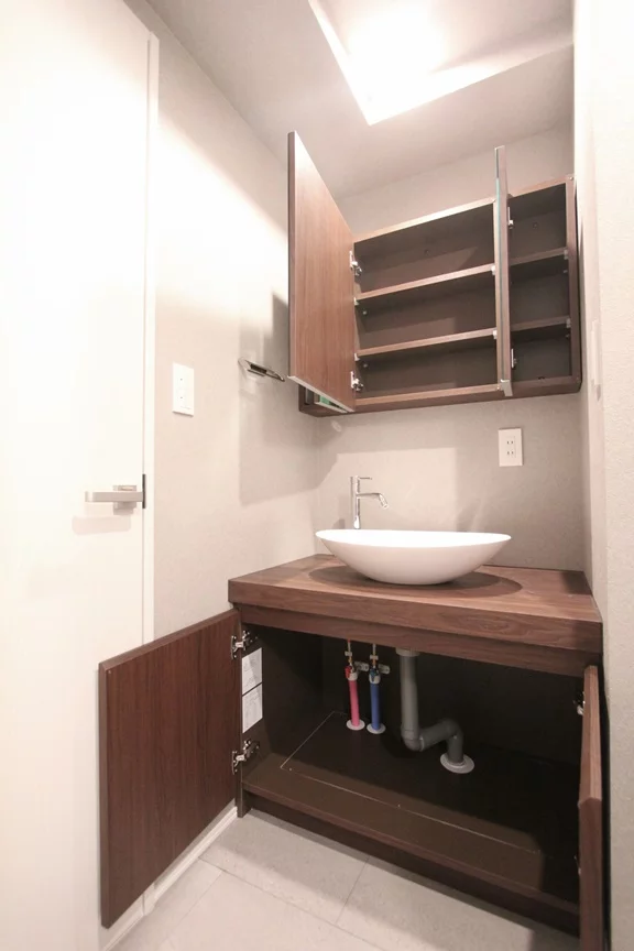 水回りはゆとりある広さの脱衣所を完備しており、人気の独立洗面台も三面鏡仕様で鏡の内側に収納スペースがございます。日用品や化粧品などの細々した物の整理整頓も楽に行えます。