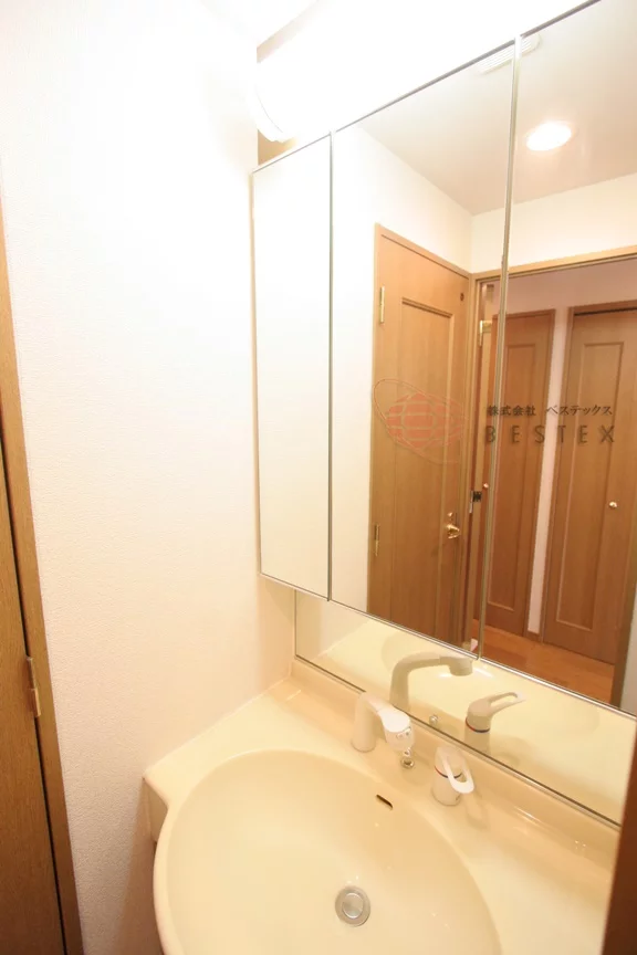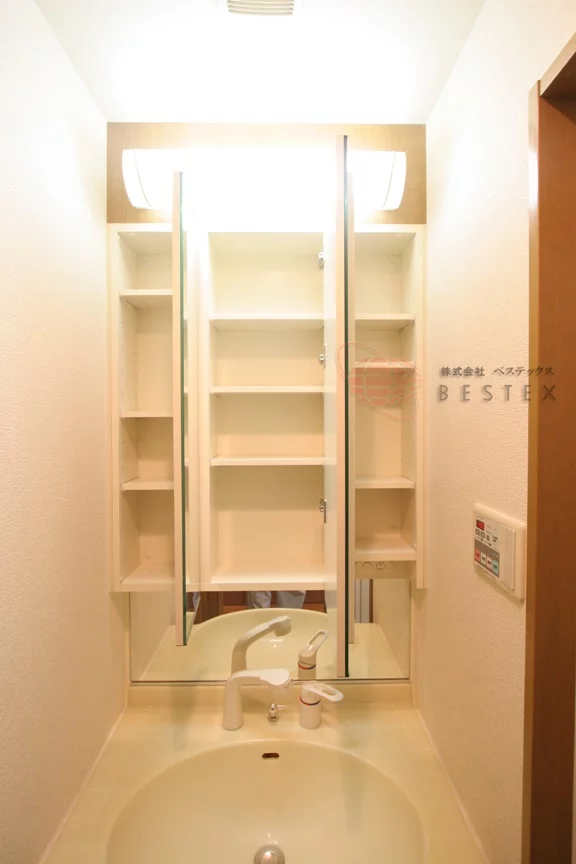 水回りには三面鏡仕様の独立洗面台もあるので朝の身支度も捗ります。