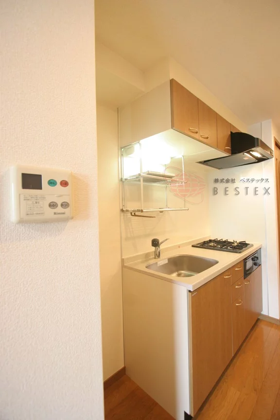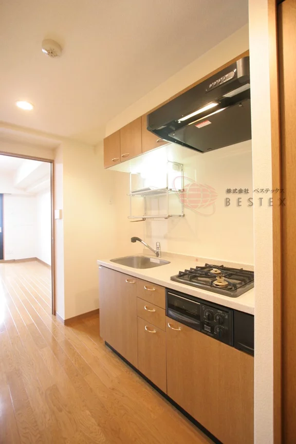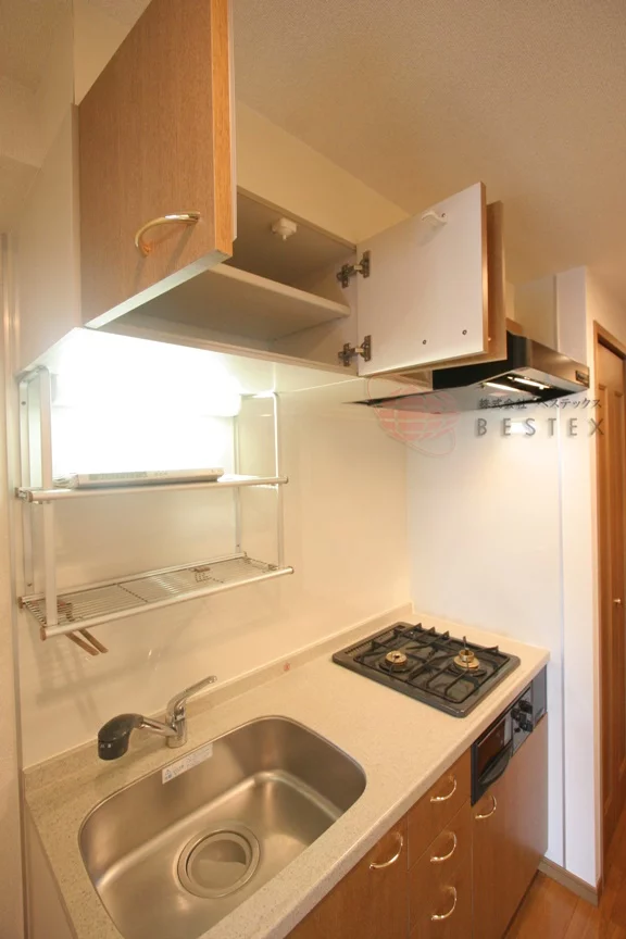 キッチンは、2口ガスコンロキッチンとなっており、冷蔵庫・電子レンジもキッチン横に置けるので、効率的にお料理を進める事ができます。調理スペース・収納スペースも十分に確保されております。
