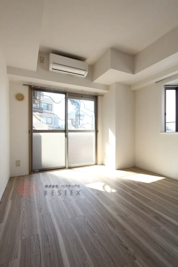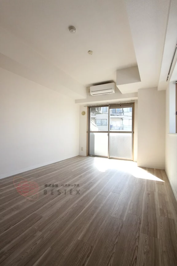 居室は約7.5帖の洋室で、床面はフローリングとなっております。バス・トイレは別々の造りとなっております。そのほか、エアコンや室内洗濯機置き場などの設備がございます。