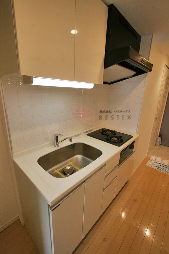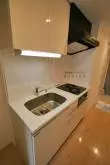 約1.5帖のキッチンには、コンロを二口設置してあり、冷蔵庫の