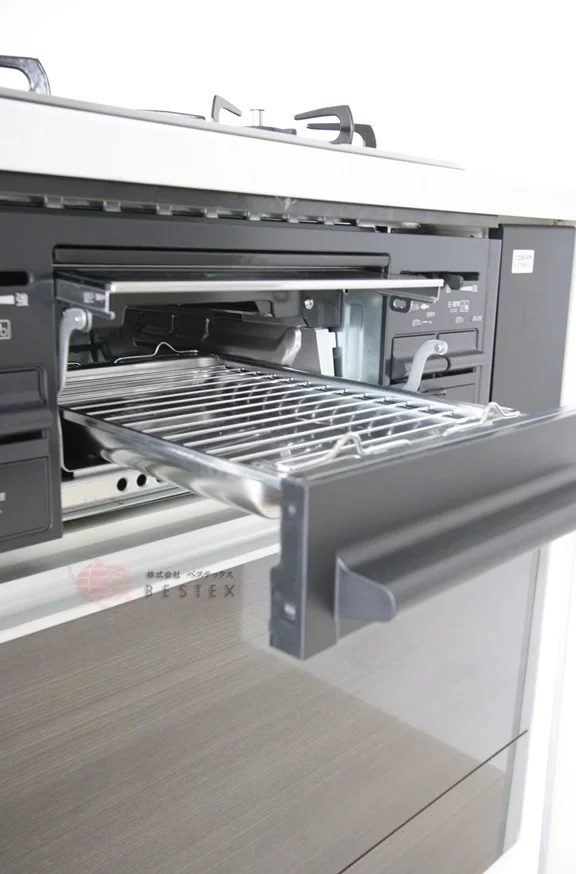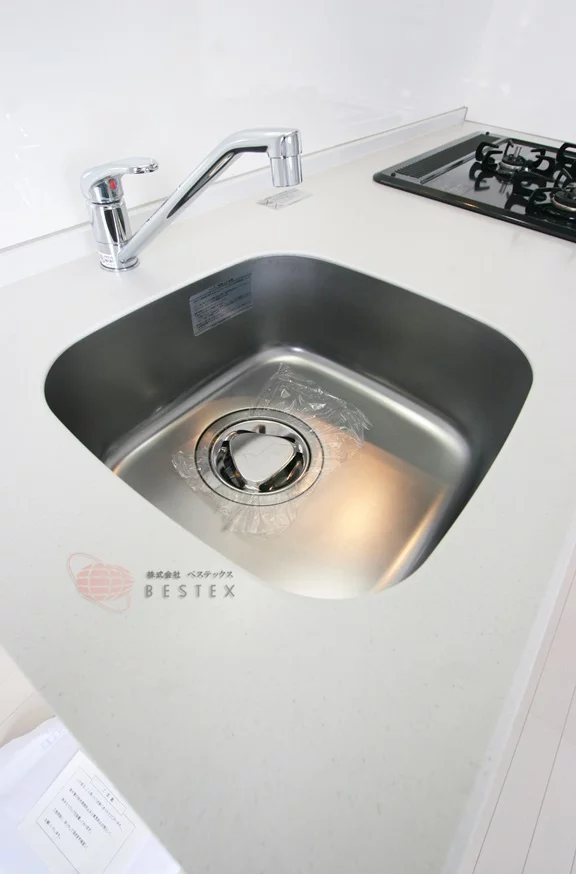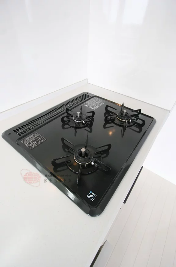 リビングのキッチンは、三口ガスコンロで調理スペース・収納スペースも十分に確保されており、冷蔵庫・電子レンジもキッチン横に置けるので効率的にお料理を進める事ができます。