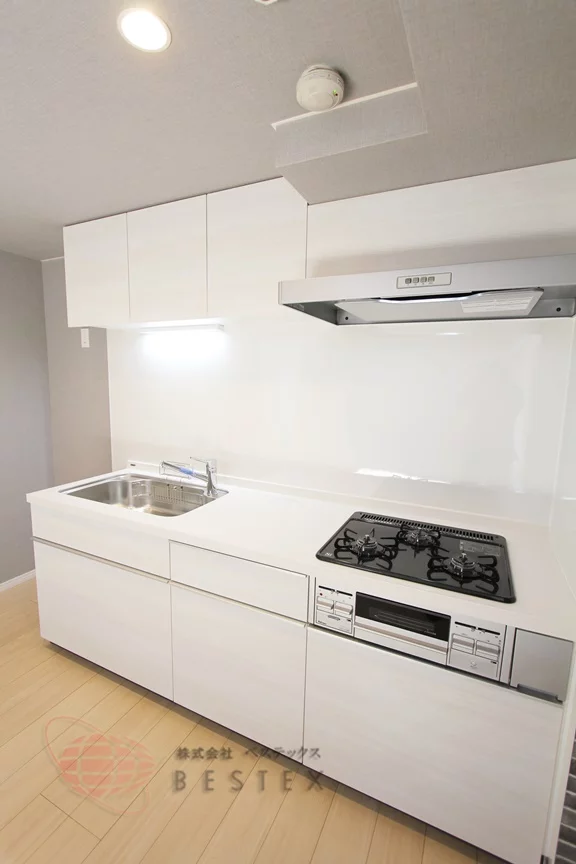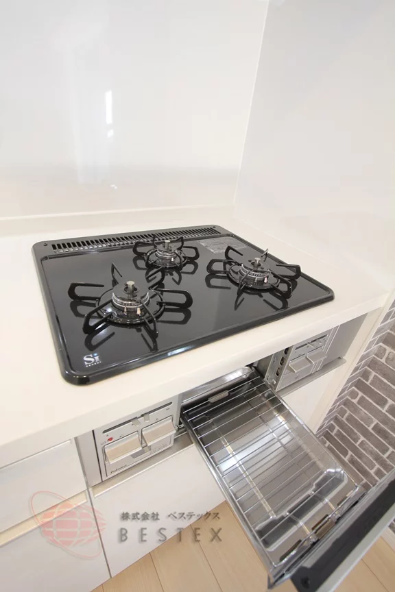 ②.キッチンは3口ガスコンロ+グリル付きのシステムキッチン!