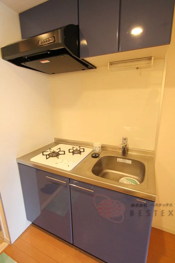キッチンは二口ガスコンロタイプですので普段自炊される方にピッタリです。徒歩5分以内にスーパーなどもあるので、生活には困りません。冷蔵庫に電子レンジ、ケトルと必要なものは全てあるので、引っ越しの際にわざわざ用意する必要が無いのが便利ですね。