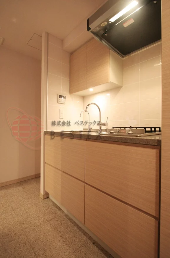 2口のガスコンロが完備されているキッチンは使い勝手が良く、収納力もあるので調理器具をたくさんお持ちの方でも安心してご利用頂けます。2.7帖と作業をするには十分なスペースを備えているので、料理の時間を快適にお過ご頂けるでしょう。