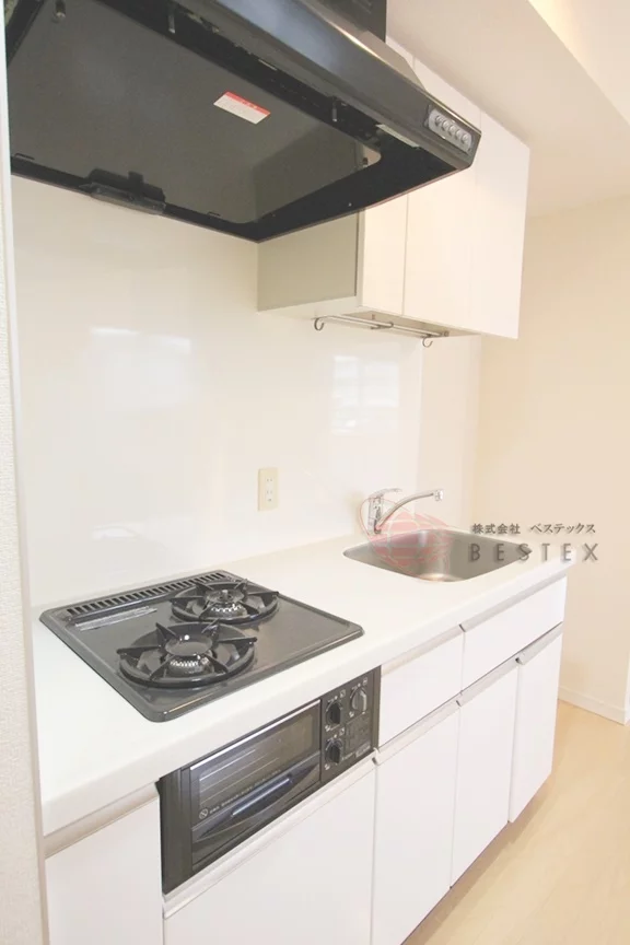 キッチンは縦に並んだスタイリッシュな女性に嬉しい2口ガスシステムキッチンとなっております。