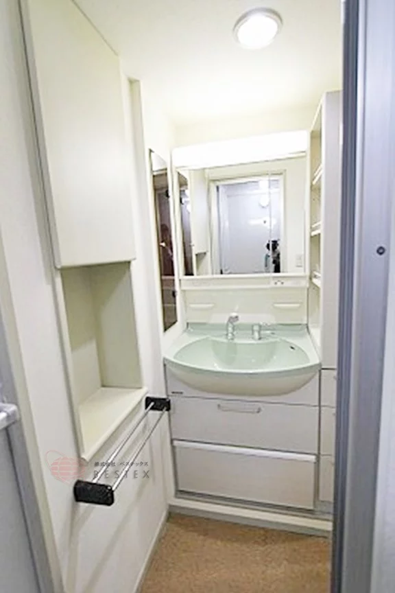 浴室の前には洗面室兼脱衣所がありますので、居室で服を脱ぐ必要もありませんし洗面所なので、もちろん独立洗面台も完備しています。