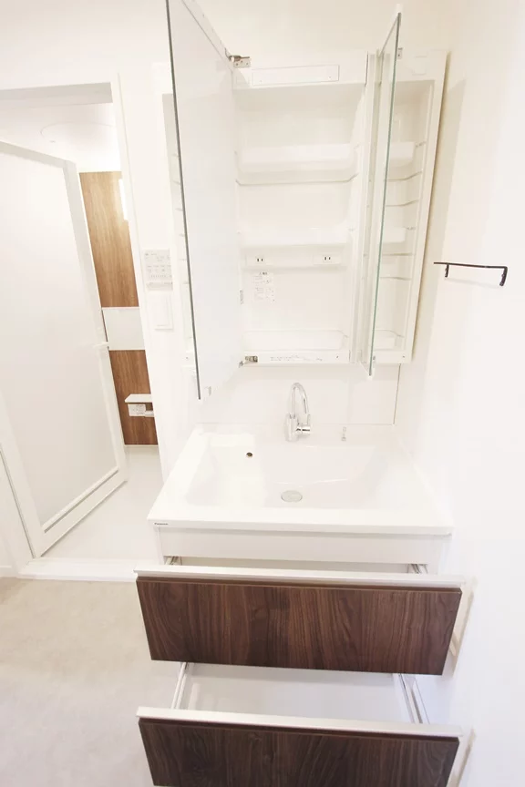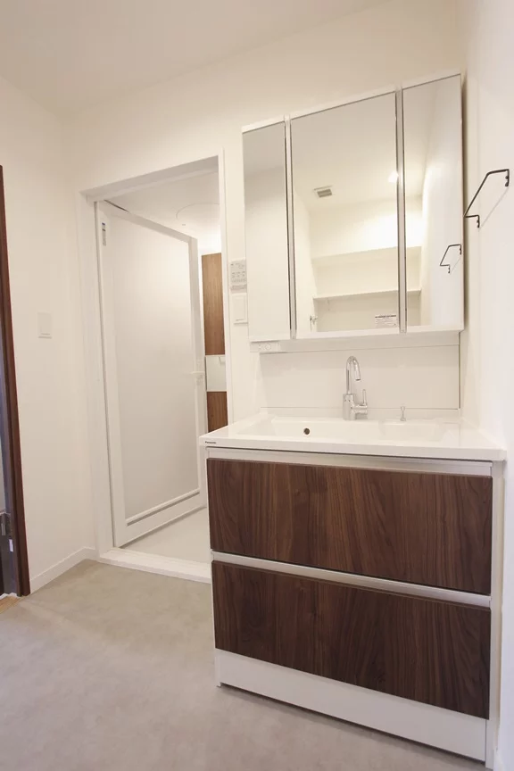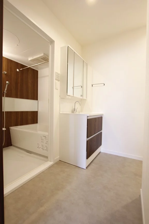 浴室の前には洗面所兼脱衣所が御座いますので、洗面所にもなっていますので人気の設備である独立洗面台も完備しております。