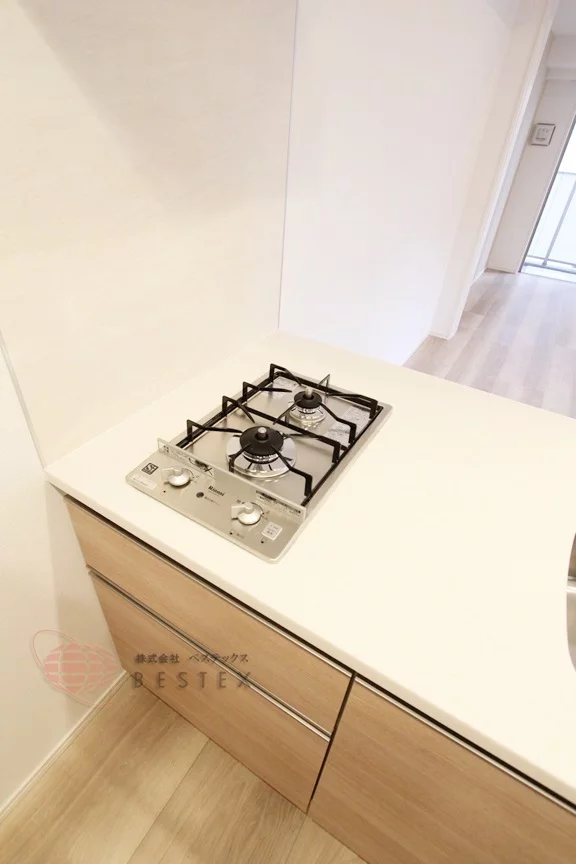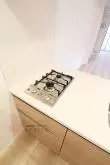 キッチン設備では2口のガスコンロが備え付けられたシステムキッチンになっています。