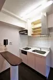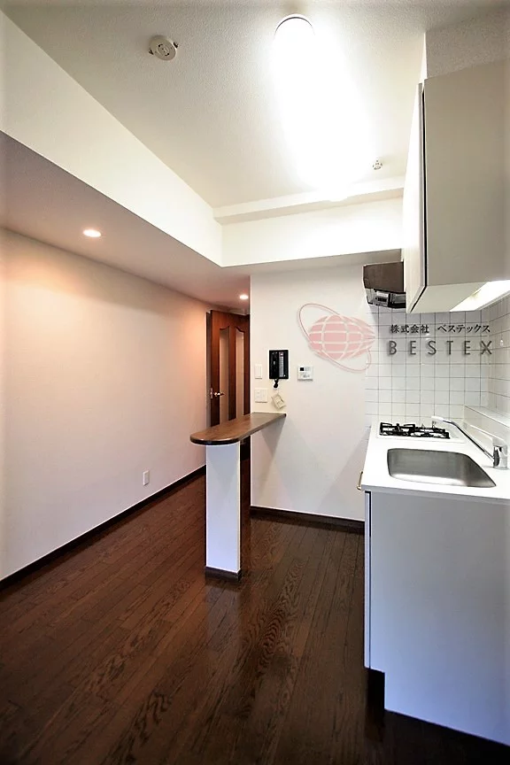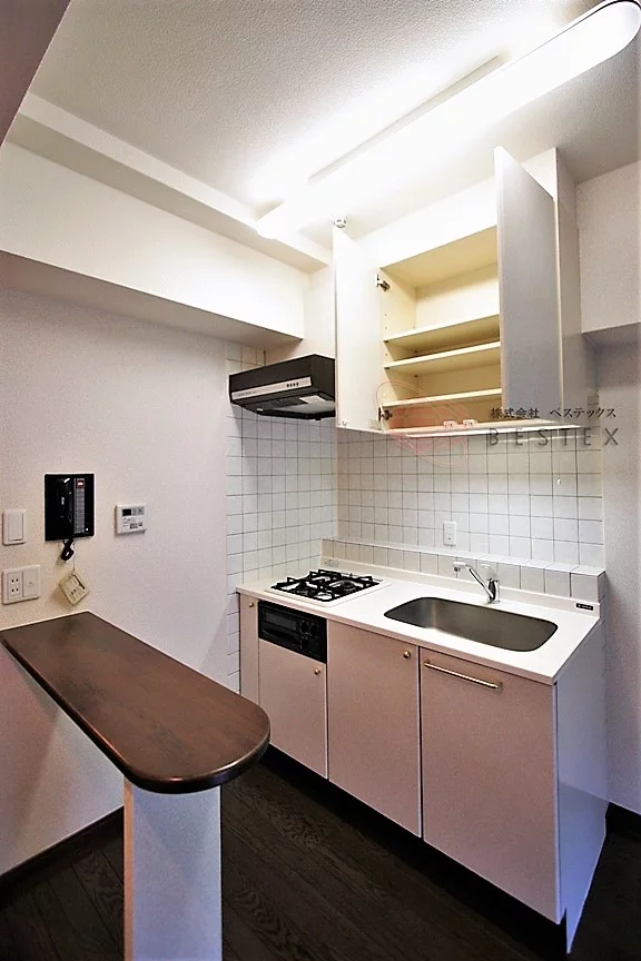 ダイニングキッチンは約7帖の広さがあり、グリル付きガス2口コンロのシステムキッチンではゆとりを持って調理が可能!キッチンの後ろにはカウンターが付いています。