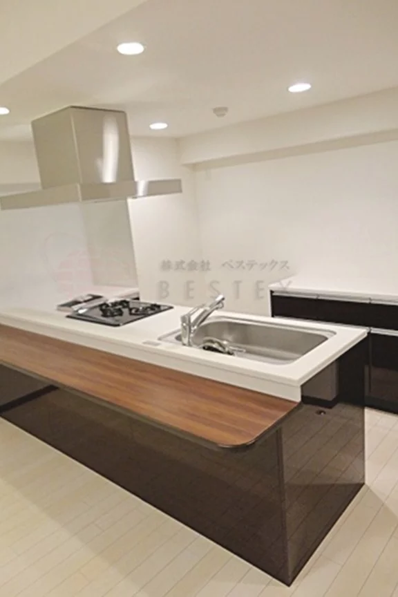 ■キッチンには人工大理石の天板を採用。調理時の使い勝手も良い3口ガスコンロを装備したシステムキッチンとなっております。