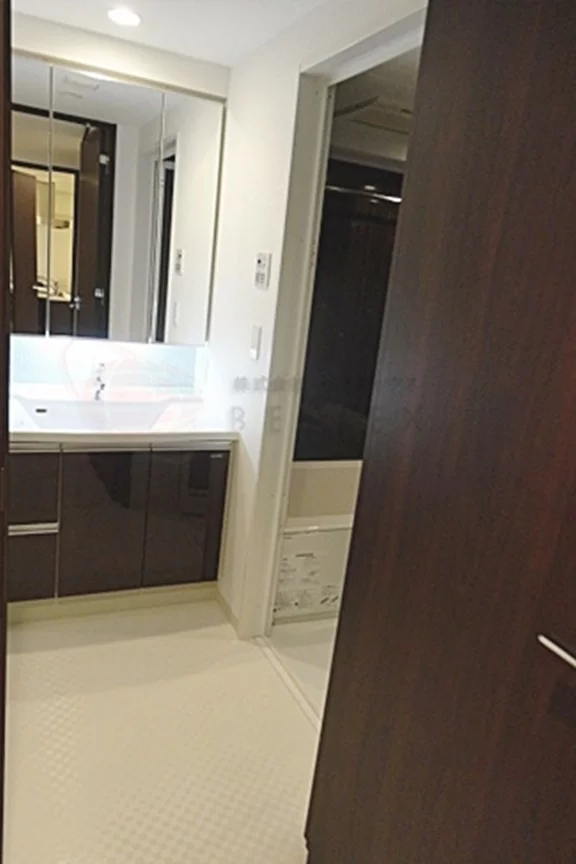 ■洗面化粧台にはドレッサータイプを採用。三面鏡付きでシャワー水栓を備えたスタイリッシュなデザインのドレッサーです。