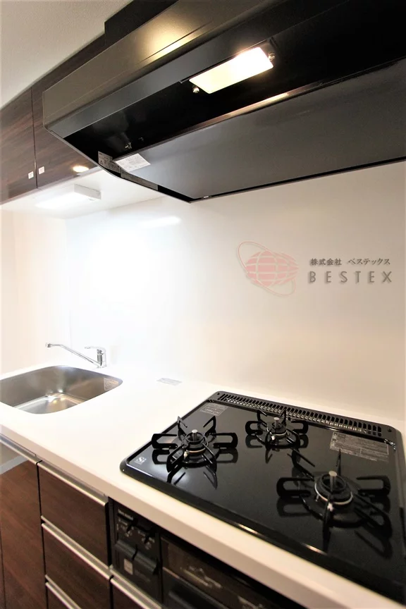 キッチンはリビングとは壁で隔たれており、グリル付き3口ガスコンロのシステムキッチンでお料理も快適♪収納スペースも豊富です!
