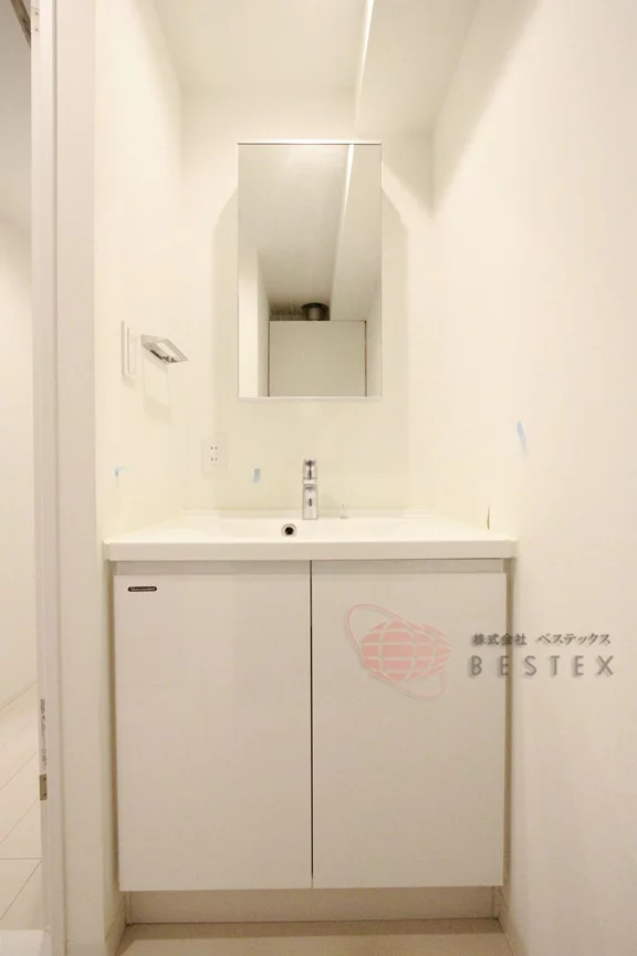 脱衣所には室内洗濯機置場と独立洗面台があり、独立洗面台の下部と鏡の裏には収納も完備!