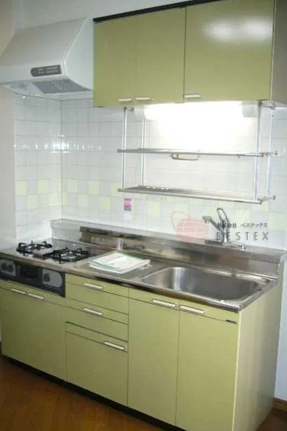 キッチンはガスコンロのシステムキッチン。キッチンの背面には、扉で隠せるようになっている室内洗濯機置場も御座います!