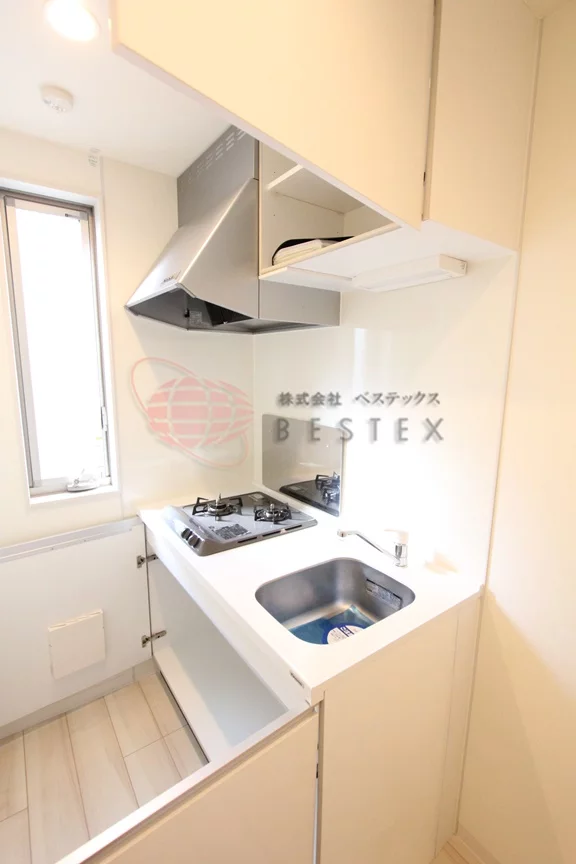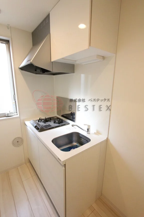 キッチン部分にはガスコンロ2口付きのシステムキッチンが御座いますので、