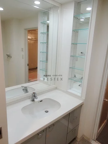脱衣洗面所には大きな独立洗面台ほか、室内洗濯機置き場と収納もございます。