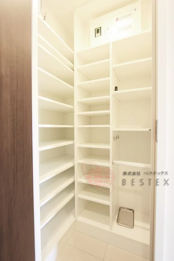 こちらのお部屋の魅力はなんといっても収納スペースの多さです!玄関収納ではシューズインクローゼット完備で、履物以外にも防災グッズなどを収納しておくことが出来ますね!寝室にはウォークインクローゼットがあり、季節物の衣類なども保管しておくことが出来ます◎その他にもお手洗いや洗面所内にも棚などが設置されており、消耗品のストック分などの保管スペースにも困りません。高層階になりますので、見通しも良く日当たりにも期待できます♪