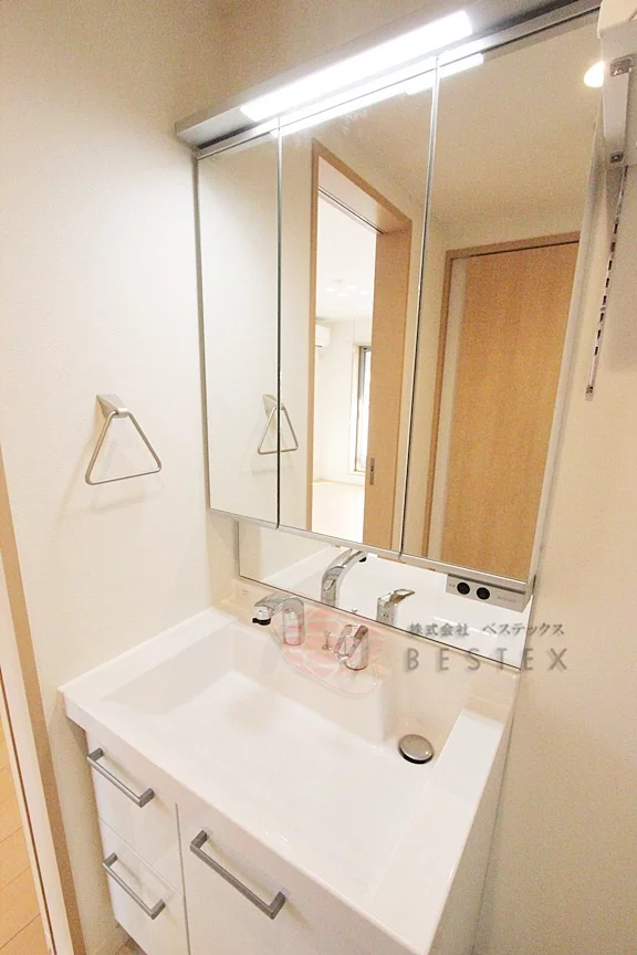洗面室は大きな独立洗面台が備わっており、脱衣所としての広さも十分!