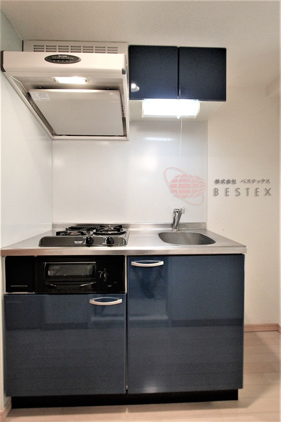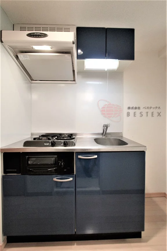 キッチンは2口ガスコンロが備わったシステムキッチンになっておりスッキリとしたキッチン周り!