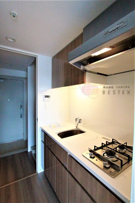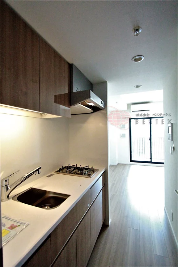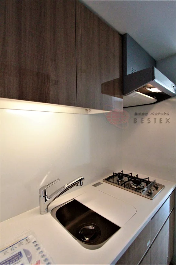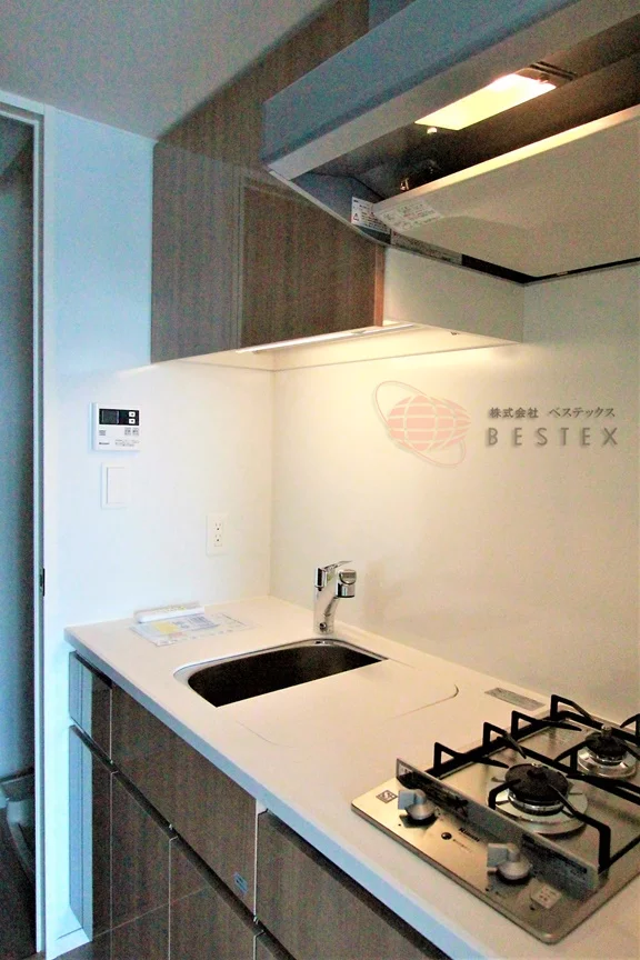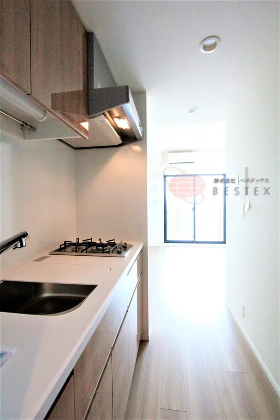 キッチンは2口コンロのシステムキッチン。キッチン自体にも収納スペースが多く備わっているので、一人暮らしの食器類などはスッキリとしまうことが出来ます♪
