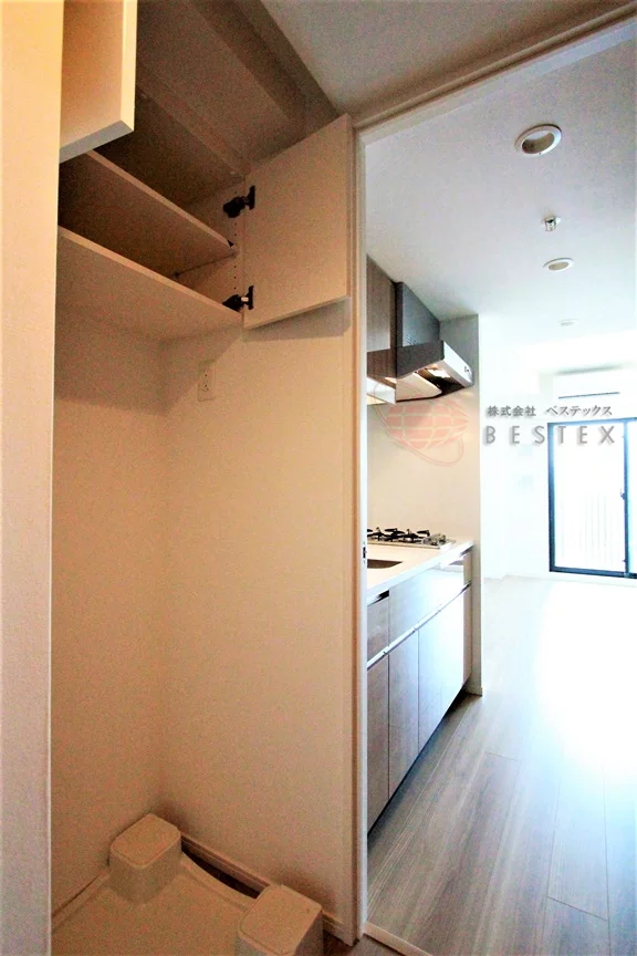 玄関を上がってすぐのところには室内洗濯機置き場があり、上部には収納も御座います。