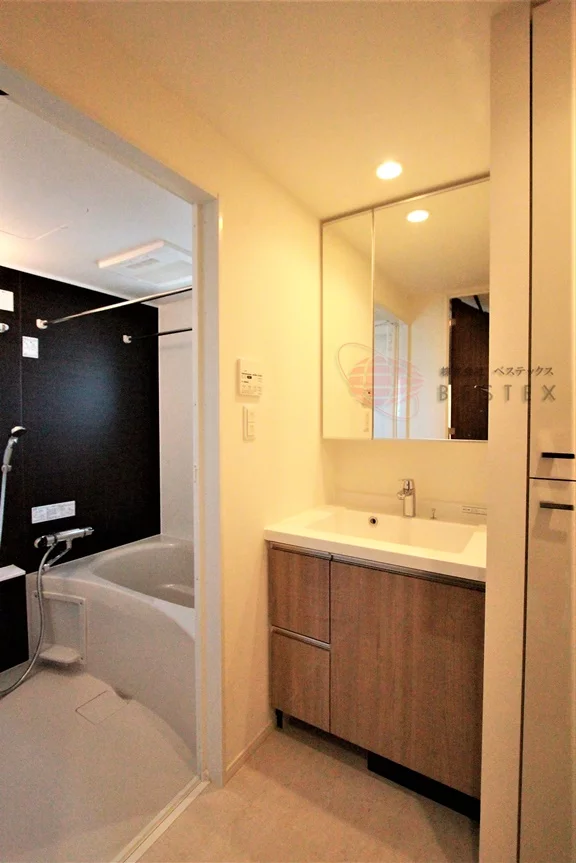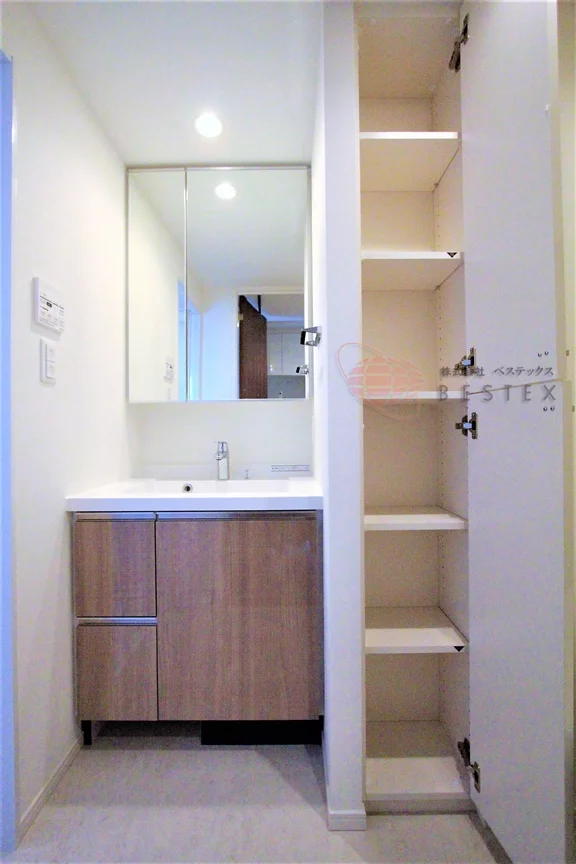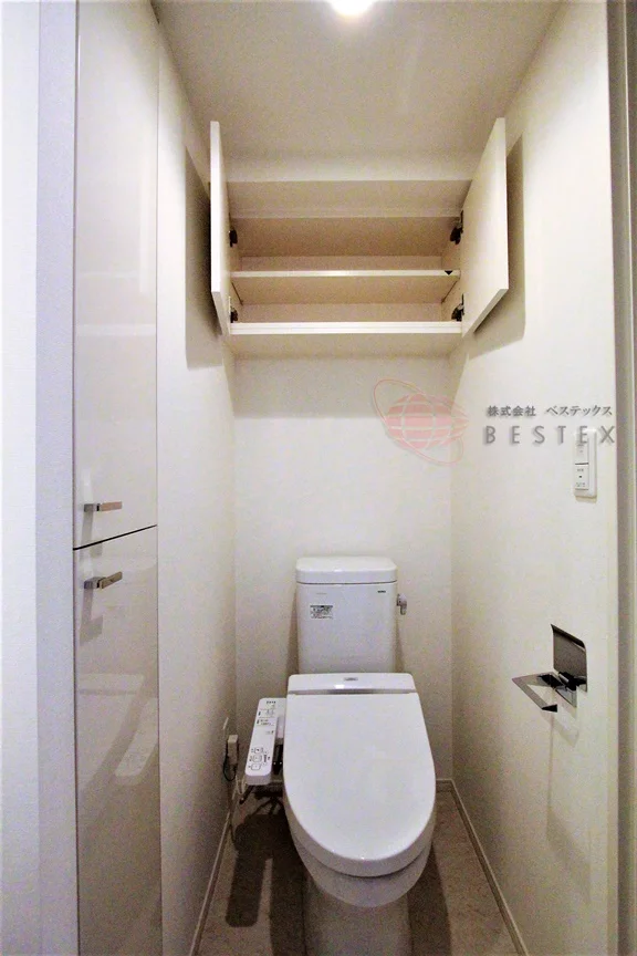 パウダールームには温水洗浄機能付きのトイレと独立洗面台があり、リネン庫や吊戸棚といった収納も完備!