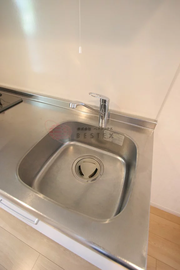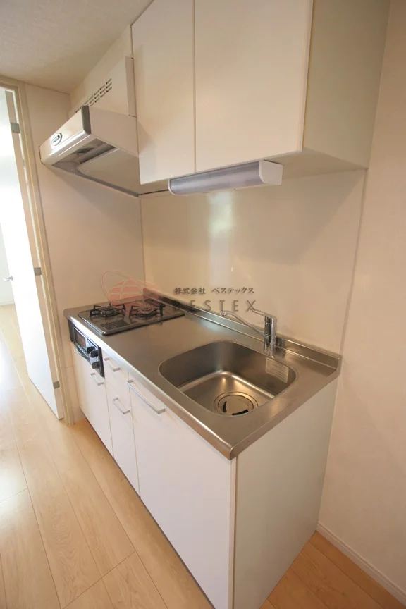 キッチンは2口ガスコンロが備わったシステムキッチンとなっており、冷蔵庫置き場も完備されております。