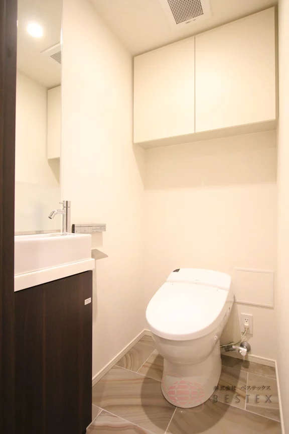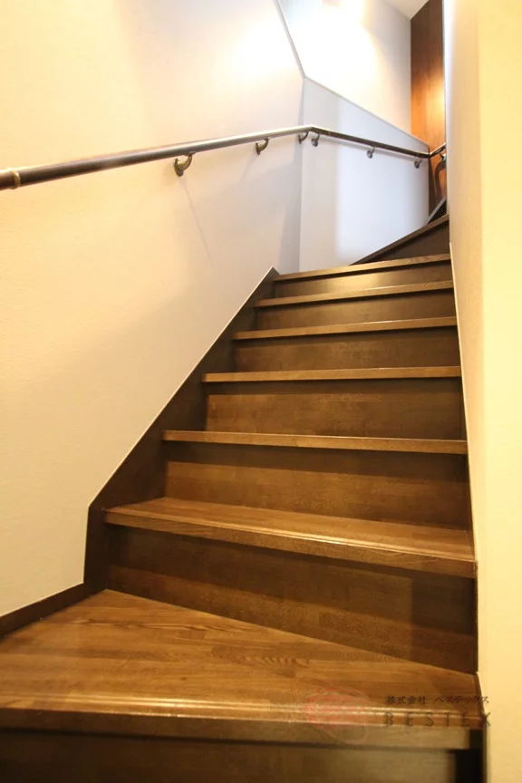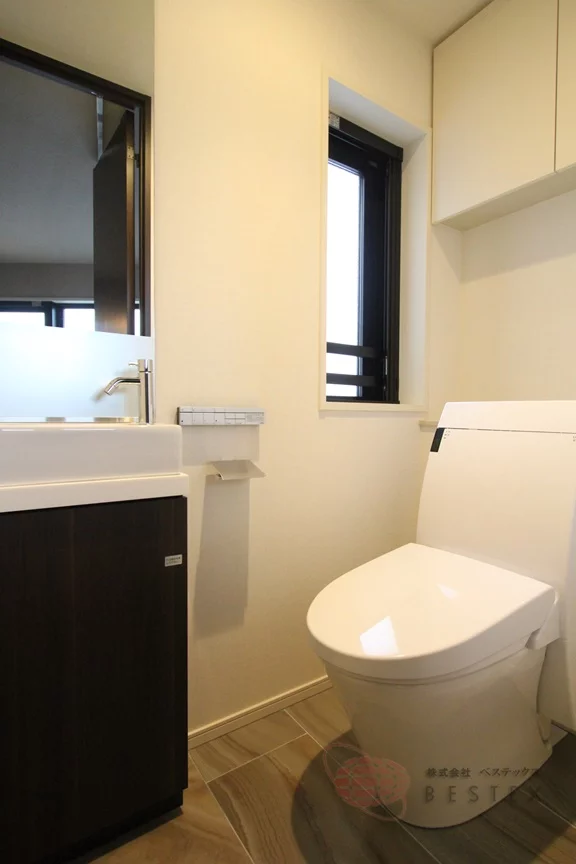 上階にはLDKや水まわりなどがあり、階段を登った踊り場には豊富な収納と、もう一つのトイレがあります。トイレには手洗い器と温水洗浄便座付き♪