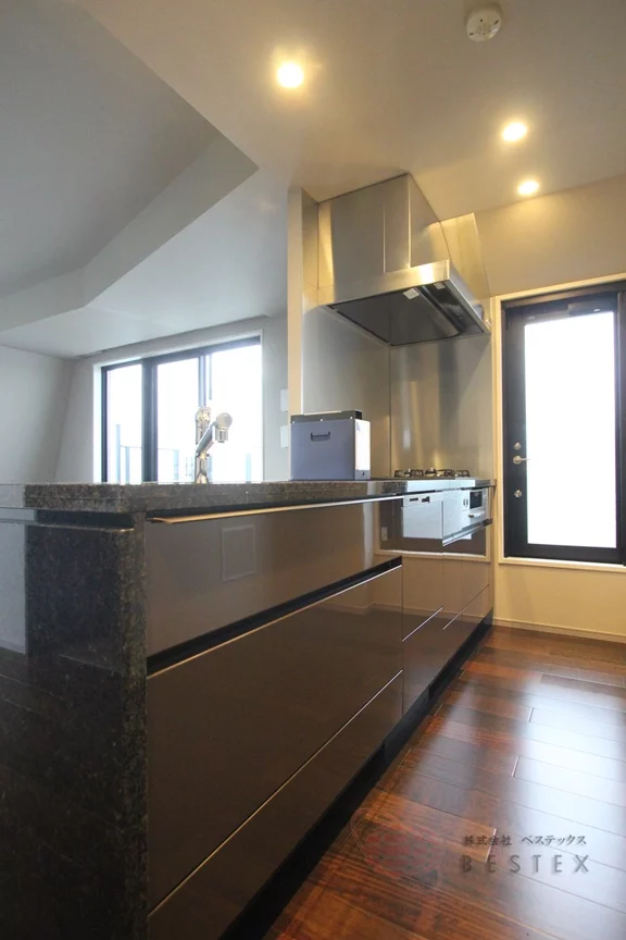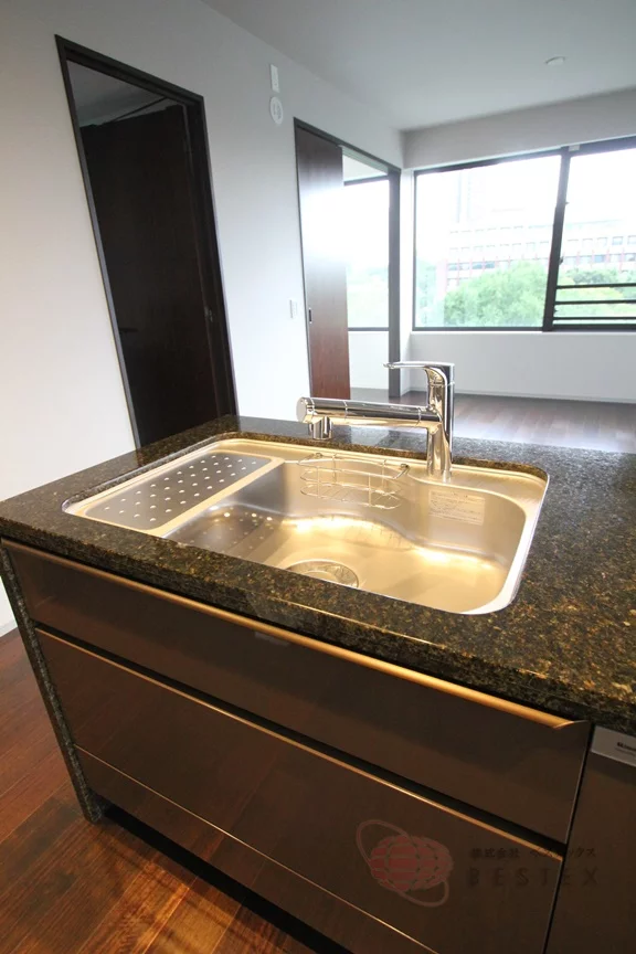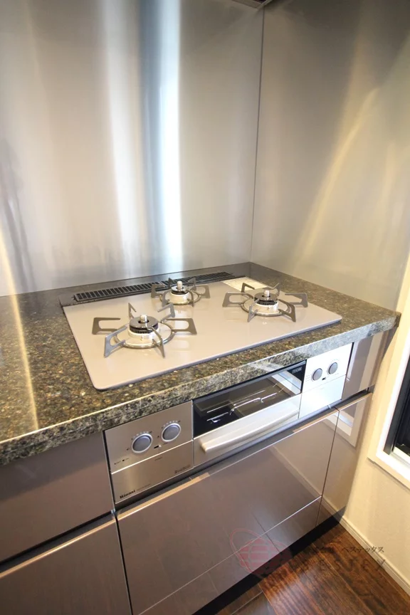 キッチンは約3.2帖。人気のカウンターキッチンで、グリル付き3口ガスコンロ、浄水器、食器洗い乾燥機、ディスポーザーを完備した、まさに充実仕様!