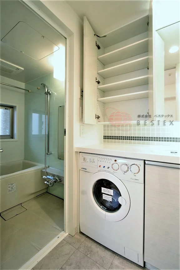 洗面台の下部には、ビルトインのドラム式洗濯乾燥機が付いています!洗面台も収納豊富です♪