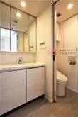 キッチンの向かい側には洗面所とトイレ・浴室があり、洗面所には大きな独立洗面台付き。脱衣スペースも兼ねており、隣のトイレには大きなリネン庫付き!