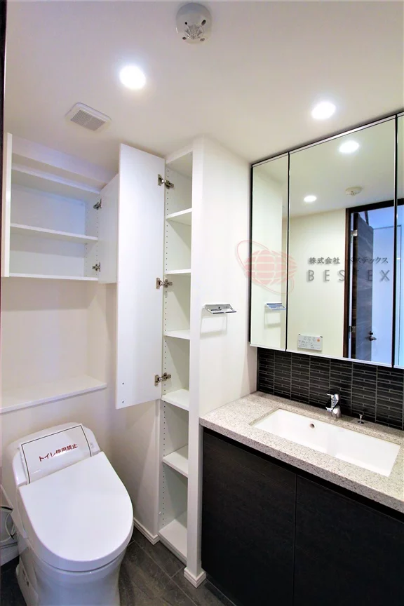 左手には洗面所・トイレと浴室があり、洗面所には大きな独立洗面台付き。脱衣スペースも兼ねており、リネン庫付きで便利!