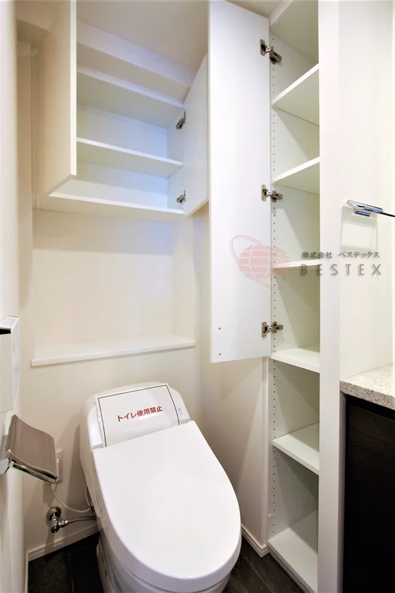 トイレはスタイリッシュなタンクレストイレで、温水洗浄機能付き。吊戸棚も備わっているので、こちらも収納に便利♪