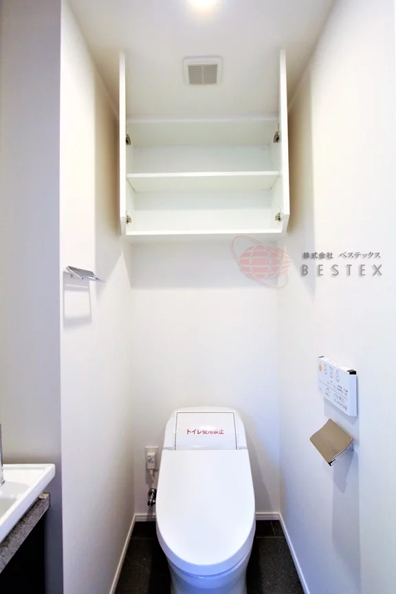 トイレはスタイリッシュなタンクレストイレで、温水洗浄機能付き。吊戸棚も備わっているので収納に便利♪