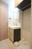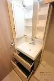 広さにゆとりのある洗面所には独立洗面台と洗濯機置き場、トイレがあり、洗濯機置き場とトイレには吊戸棚付きなので収納も便利!