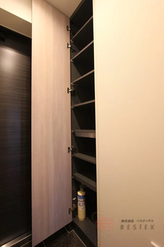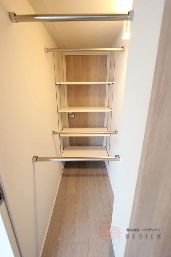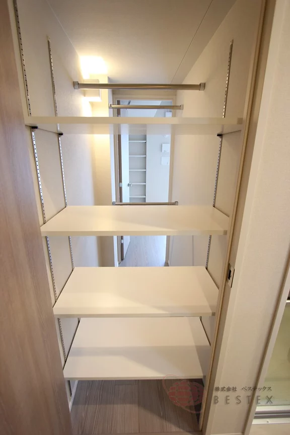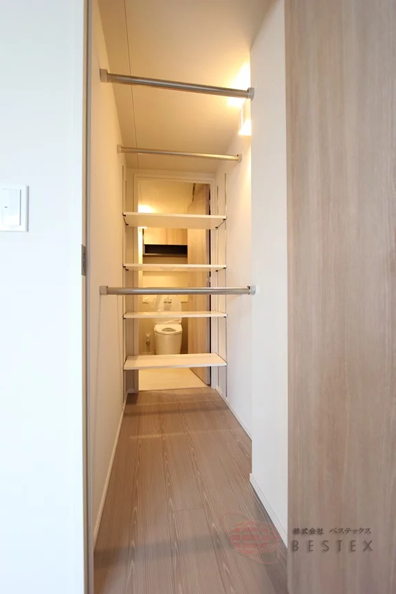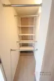 収納は吊戸棚と、トイレ側にも扉の付いた大型のウォークインクローゼットを完備!衣類などの収納だけでなく、トイレ側には洗剤やタオルなどを於いておくと便利です♪