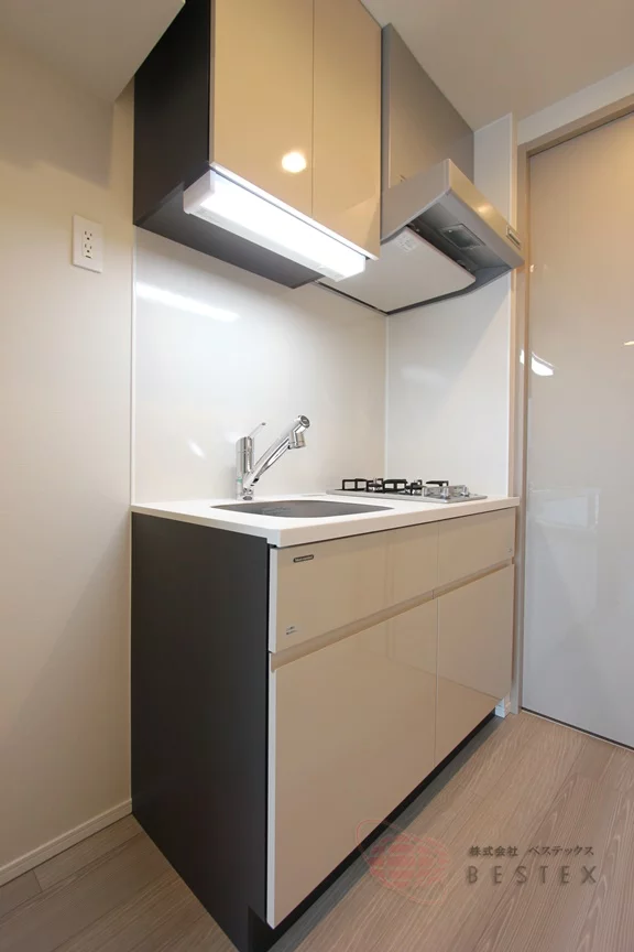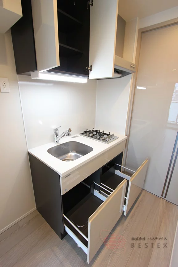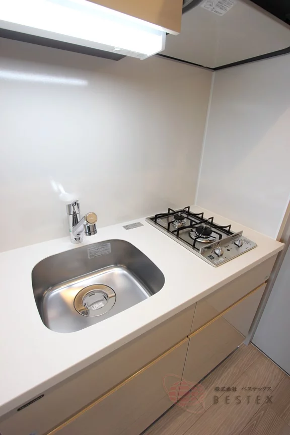 キッチンは2口ガスコンロのシステムキッチンで、引き出しや吊戸棚の収納も多く使いやすい内容♪