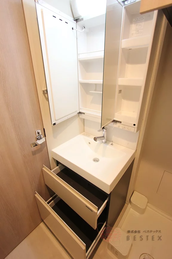 玄関を上がってすぐ左手には洗面所と浴室の水まわりが御座います。