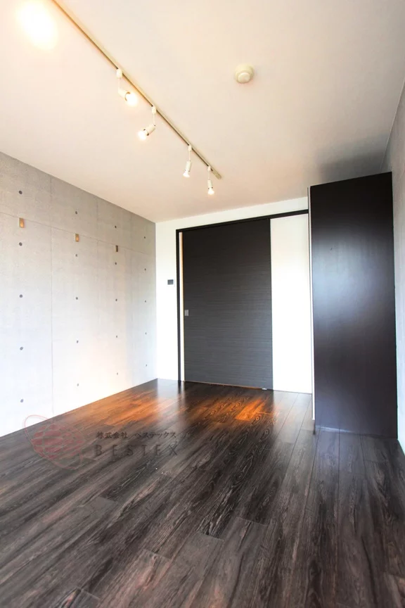 居室は高級感が有り、お手入れもしやすいオールフローリング仕様で、約8帖と広めのサイズで、無駄な梁や柱の少ないシンプルな間取りですのでベッドやテレビなどの家具配置をイメージしやすく、ゆったりとお使いいただけます。