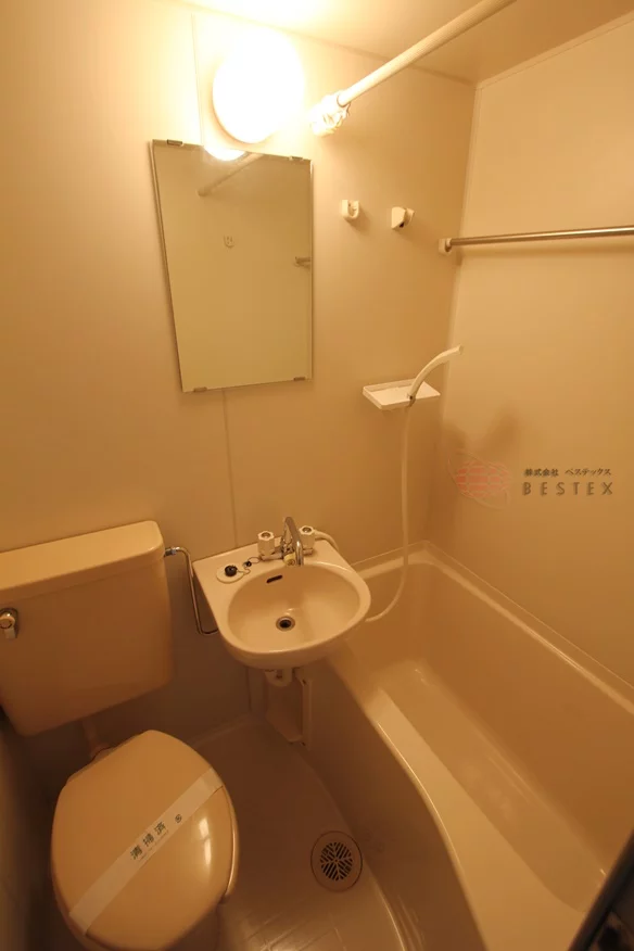 バス・トイレは一緒になったユニットタイプで、手洗いや身支など生活の様々なシーンで役立つ洗面台もついた3点ユニットバスです。