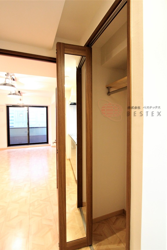 クローゼットは洋室の外、一人暮らしには十分な大きさがあり、扉には姿見が付いているのが便利です!