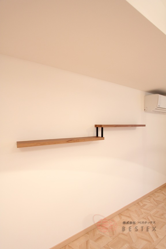 壁の一面にはちょっとした物を置ける棚も備え付けられており、インテリアも楽しめます。