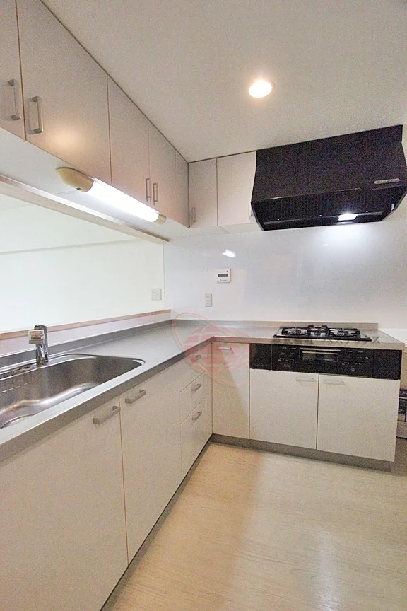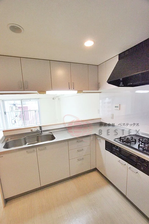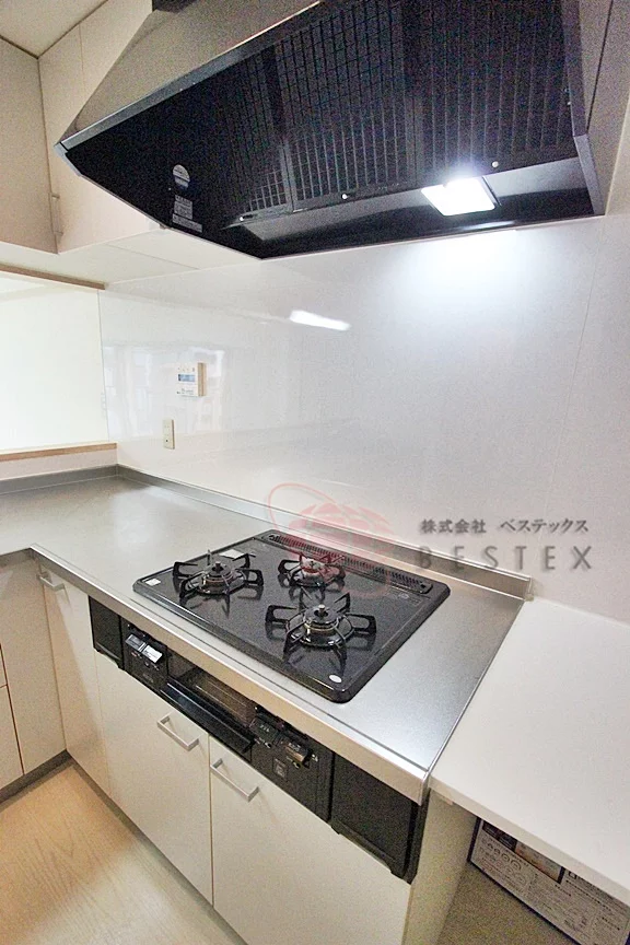 L字型ガスシステムキッチン。ガス3口コンロ・グリル完備。